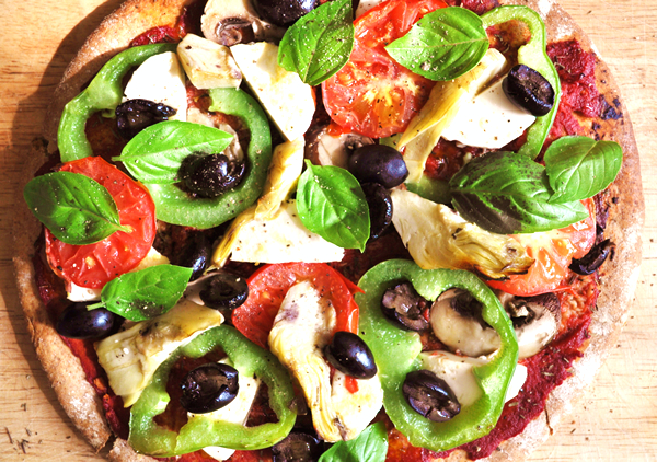 3. Now drizzle over the olive oil, making sure the tofu and veggies are well coated. Place on top shelf of a pre-heated oven and cook for about 8 – 10 minutes, depending on your base. Keep your eye on it. Once baked, finish off your masterpiece with fresh basil leaves and freshly cracked pepper! Enjoy!