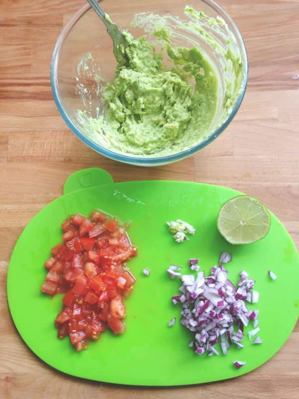 3. Add in the chopped tomato, lime juice, crushed garlic, onion and seasoning. Mix together.