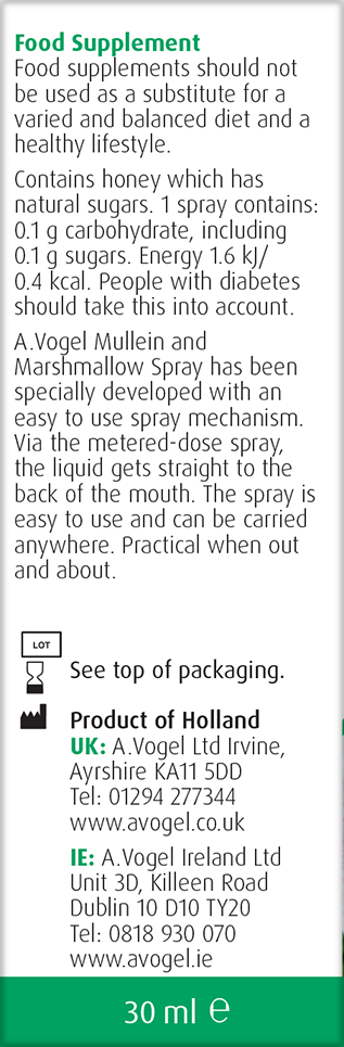 A.Vogel Mullein & Marshmallow Spray is a food supplement. Naturally sourced active ingredients A.Vogel Mullein & Marshmallow Spray contains a combination of naturally sourced active ingredients. Its ingredients are non-habit forming and non-drowsy. Handy dosage spray A.Vogel Mullein & Marshmallow Spray has been specially developed with an easy to use spray mechanism. Via the metered dose spray, the liquid gets straight to the site where it needs to be. The spray is easy to use and can be carried anywhere. Practical when out and about.