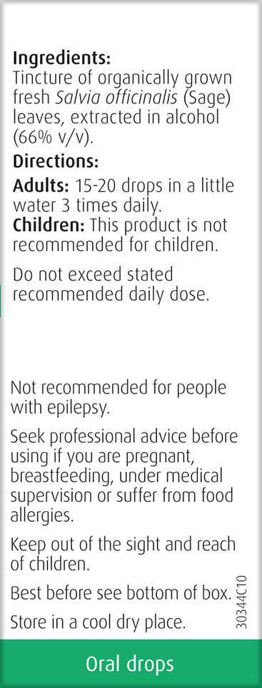 Tincture of organically grown fresh Salvia officinalis (Sage herb) leaves, extracted in alcohol (66%V/V).