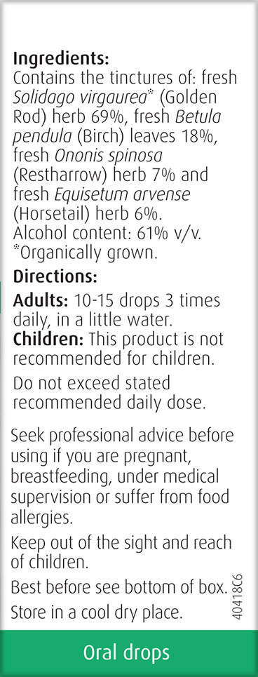 Contains the tinctures of fresh Solidago virgaurea* (Golden Rod) herb 69%, fresh Betula pendula (Birch) leaves 18%, fresh Ononis spinosa (Restharrow) herb 7% and fresh Equisetum arvense (Horsetail) herb 6%.